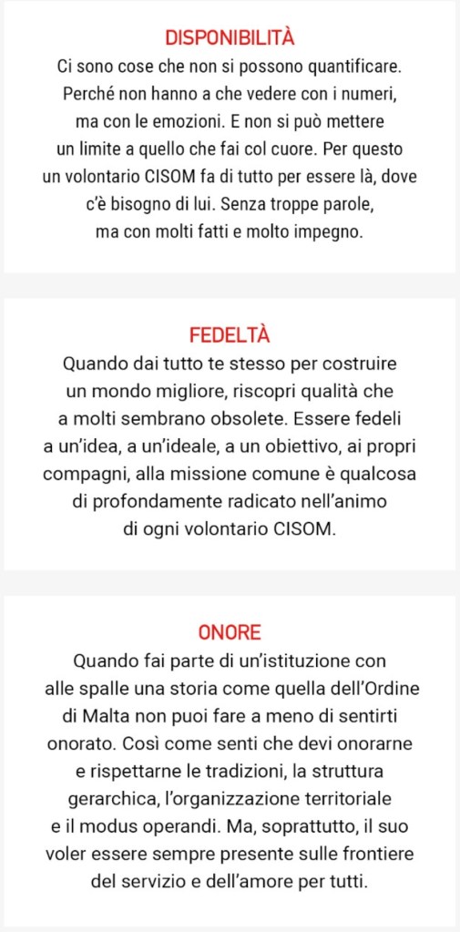 Sua Altezza il Principe, nel ringraziare tutti i volontari e volontarie presenti, ha voluto ricordare l’opera millenaria dell’Ordine di Malta, detto Sovrano per sottolinearne le prerogative, da essere “usate” per dare il massimo supporto necessario al fine ultimo della difesa della fede e aiuto ai poveri; l’opera del volontariato insieme allo spirito di solidarietà va insegnata ai giovani con l’esempio di quello che organizziamo verso i bisognosi e in particolar modo per gli anziani.